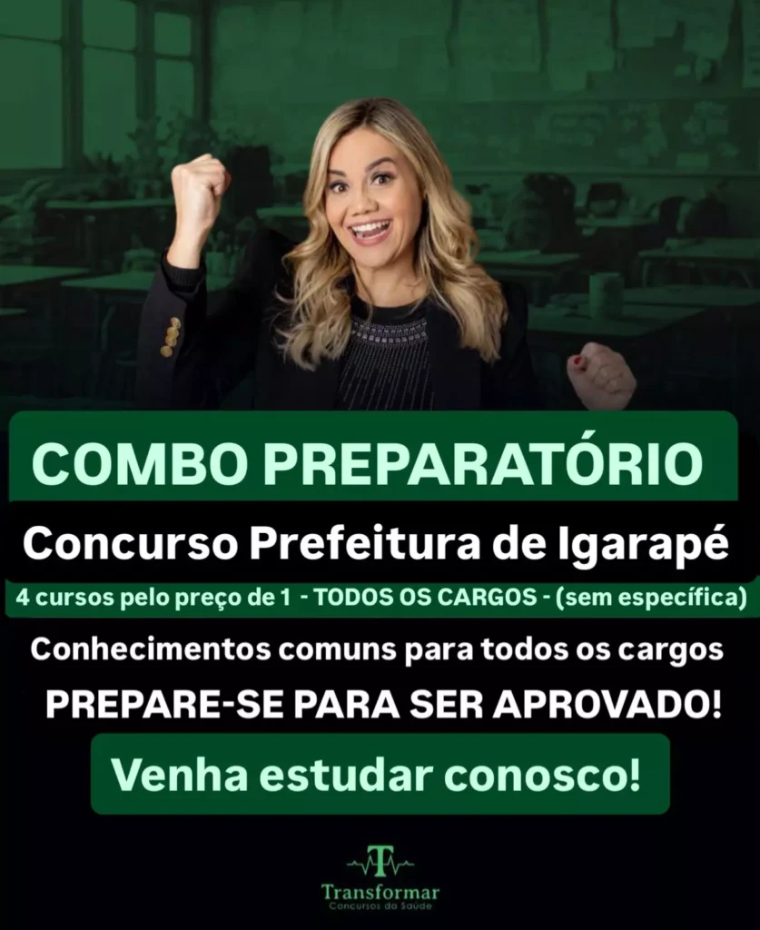 TODOS OS CARGOS (SEM ESPECÍFICA) – COMBO PREPARATÓRIO CONCURSO PREFEITURA DE IGARAPÉ – CONHECIMENTOS COMUNS – (curso teórico completo, curso de exercícios, semana de véspera e aulão de véspera)